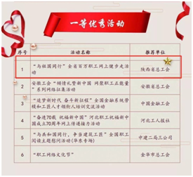 其中,由陜西省總工會主辦、上海建朗信息科技有限公司提供技術(shù)支持的“與祖國同行”全省百萬職工網(wǎng)上健步走活動榮獲“一等優(yōu)秀活動”!
