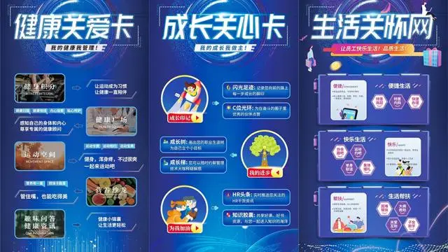 兩卡一網(wǎng)”是利用云計(jì)算等技術(shù),為員工的身心健康、職業(yè)成長(zhǎng)和便捷生活構(gòu)建“兩卡一網(wǎng)”智慧服務(wù)云平臺(tái)?!皟煽ㄒ痪W(wǎng)”包括“員工健康關(guān)愛(ài)卡”“員工成長(zhǎng)關(guān)心卡”和“員工生活關(guān)懷網(wǎng)”。其中,“員工健康關(guān)愛(ài)卡”通過(guò)體檢檔案管理、運(yùn)動(dòng)打卡積分、營(yíng)養(yǎng)指導(dǎo)等為員工提供個(gè)性化健康指導(dǎo),系統(tǒng)管理身心狀態(tài);“員工成長(zhǎng)關(guān)心卡”通過(guò)閃光足跡、成長(zhǎng)樹(shù)、HR頭條等記錄員工職業(yè)成長(zhǎng)歷程,幫助員工明晰職業(yè)生涯發(fā)展方向;“員工生活關(guān)懷網(wǎng)”以品質(zhì)生活為始點(diǎn),通過(guò)特惠商超、線上菜籃子工程、協(xié)會(huì)趣吧、困難幫扶等,讓員工生活更加便捷、更加實(shí)惠、更加快樂(lè)。