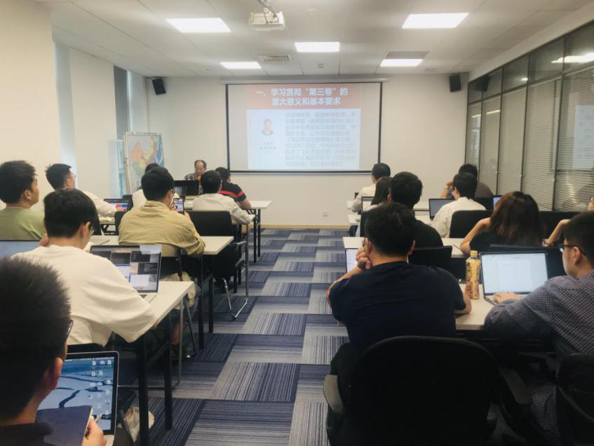 奚會長重點講述了2020年6月發(fā)行的《習近平談治國理政》第三卷,并通過鮮明主題:不忘初心、牢記使命;核心戰(zhàn)略:做好我們自己的事情;大國擔當:構建人類命運共同體;關鍵在黨:把自我革命推向深入4個方面進行了深入解讀。奚會長表示建朗作為政企軟件服務平臺的建設企業(yè),一定要緊扣國家方向,提前布局。同時他也建議建朗的員工多去黨的歷史博物館參觀、學習,有益于開拓政企軟件產(chǎn)品的研發(fā)思路。