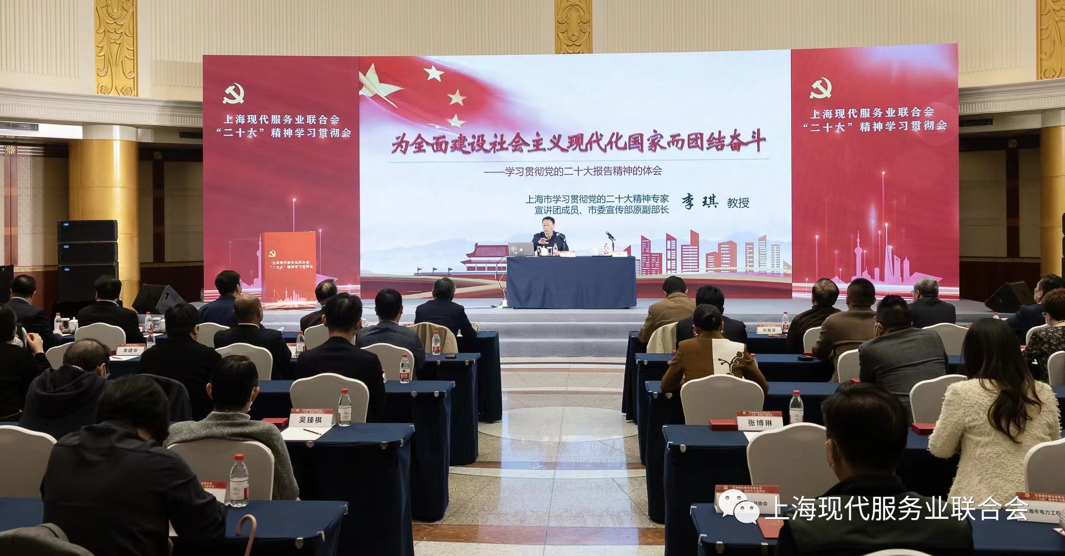 11月17日下午,上?,F(xiàn)代服務(wù)業(yè)聯(lián)合會(huì)在上海國際會(huì)議中心舉行學(xué)習(xí)貫徹黨的二十大精神報(bào)告會(huì)暨優(yōu)秀企業(yè)家授牌頒證活動(dòng),上海市學(xué)習(xí)貫徹黨的二十大精神專家宣講團(tuán)成員、市委宣傳部原副部長(zhǎng)李琪教授應(yīng)邀作輔導(dǎo)報(bào)告。聯(lián)合會(huì)會(huì)長(zhǎng)鄭惠強(qiáng)、常務(wù)副會(huì)長(zhǎng)孫建平,副會(huì)長(zhǎng)陳振鴻、李關(guān)德、簡(jiǎn)大年、卞百平等領(lǐng)導(dǎo)出席活動(dòng)。