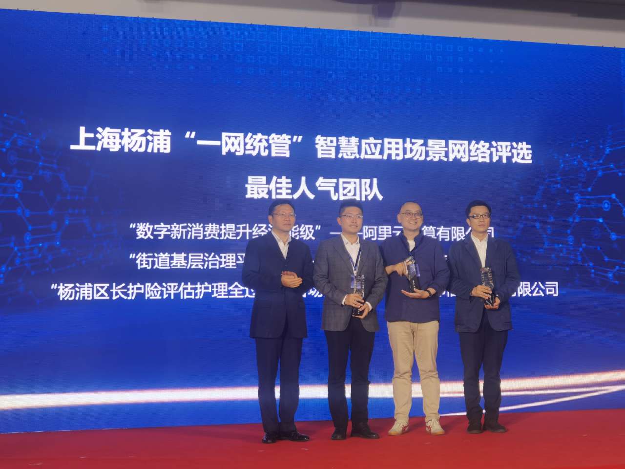 本次楊浦“一網(wǎng)統(tǒng)管”智慧應(yīng)用場景評選活動共精選了8個應(yīng)用場景進(jìn)行網(wǎng)絡(luò)評選,涉及共享單車、智慧停車、數(shù)字經(jīng)濟(jì)、垃圾分類、長護(hù)險監(jiān)管、街道基層治理、12345熱線、電梯運(yùn)維管理等城市治理領(lǐng)域。根據(jù)票選結(jié)果,楊浦區(qū)長護(hù)險評估護(hù)理全過程監(jiān)管場景名列前三,我司作為承建技術(shù)團(tuán)隊(duì)榮獲上海楊浦“一網(wǎng)統(tǒng)管”智慧應(yīng)用場景網(wǎng)絡(luò)評選“最佳人氣團(tuán)隊(duì)”獎,董事長趙巍應(yīng)邀出席并代表公司上臺領(lǐng)獎。