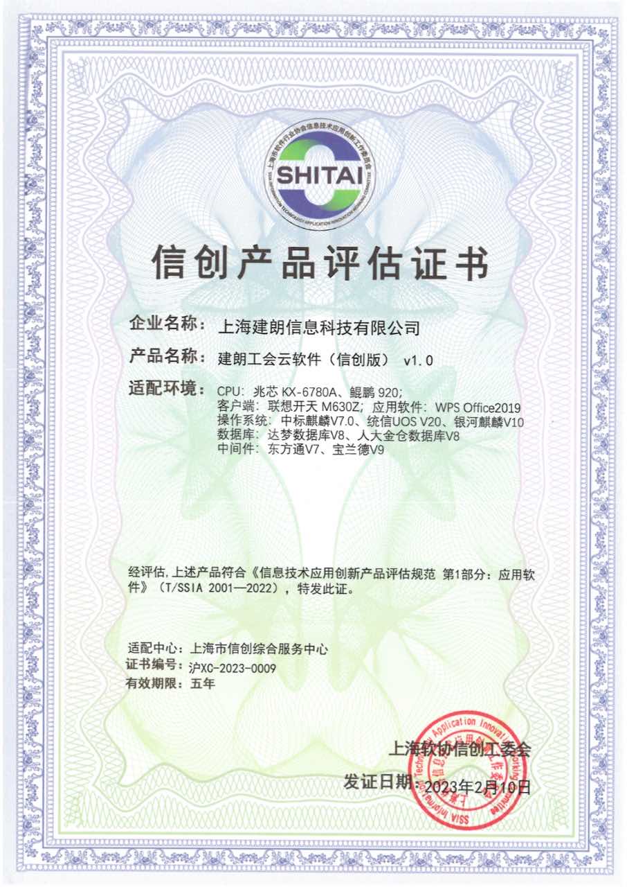 上海市經(jīng)濟和信息化委員會2020年度上海市軟件和集成電路產(chǎn)業(yè)發(fā)展專項資金項目(軟件和信息服務(wù)業(yè)領(lǐng)域)——基于國產(chǎn)軟硬件環(huán)境的網(wǎng)上工會平臺項目已順利完成專項驗收,建朗工會云產(chǎn)品獲得上海軟件協(xié)會信創(chuàng)工委會頒布的信創(chuàng)產(chǎn)品評估官方認(rèn)證。