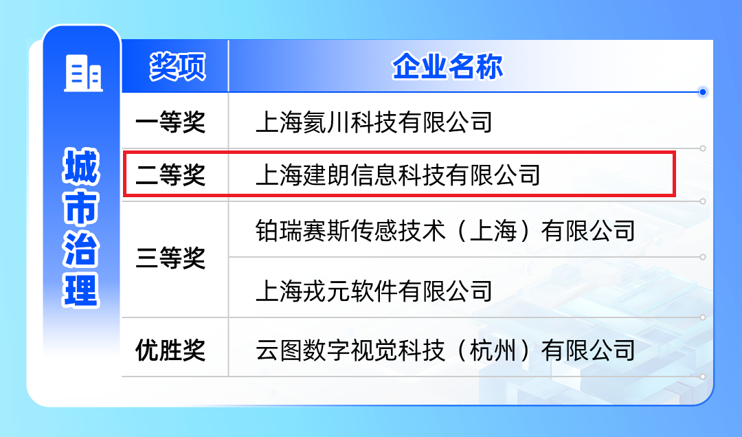上海建朗信息科技有限公司被評為“城市治理”賽道“二等獎(jiǎng)”。
